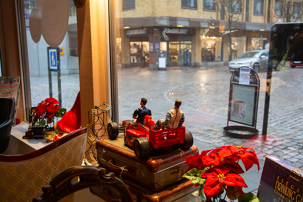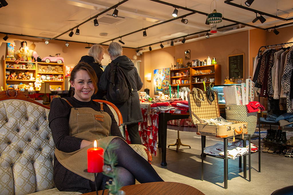 Lagom till julskyltningen öppnade Sara Bäckman ”Saras fik och secondhand”. Fikat intages med fördel i en av de antika soffgrupperna.