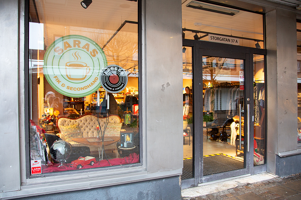 Hörnlokalen i korsningen Storgatan-Postgatan ligger mitt i smeten och lämpade sig perfekt för Saras koncept: kläder, möbler, prylar och leksaker som någon älskat förut – från enklare loppisföremål till vintage. Här ska helt enkelt finnas något för alla. Allt presenterat i en mysig miljö där man även kan fika och äta lättare rätter. Räkmackor, sallader och soppor och så hembakt förstås. Och öppettiderna kommer att följa övriga butiker i city.